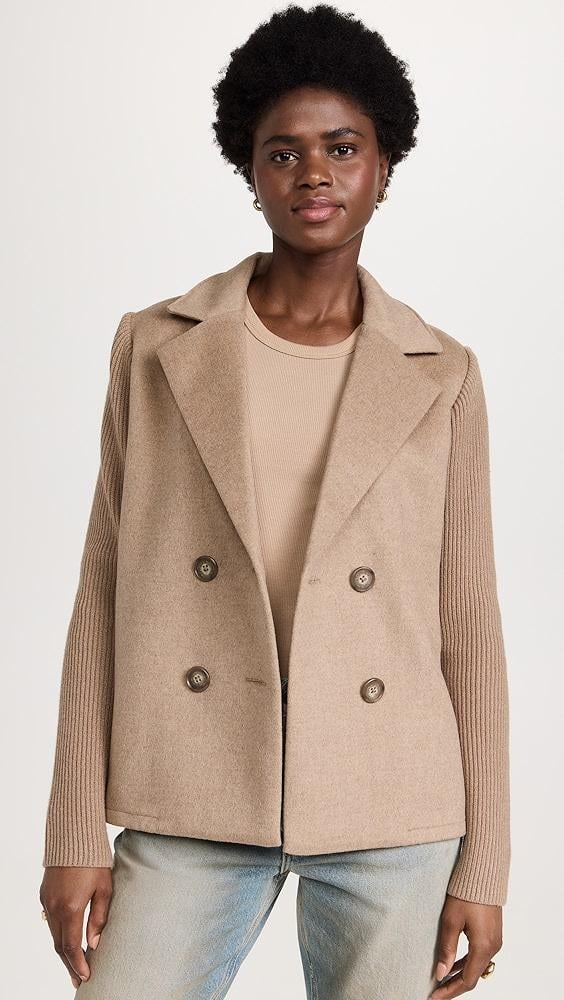 Le buste structuré conserve une ligne nette tandis que les manches en maille offrent douceur et élasticité. Résultat : un blazer qui ne serre pas, confortable assise comme en mouvement, et qui garde une tenue irréprochable toute la journée.