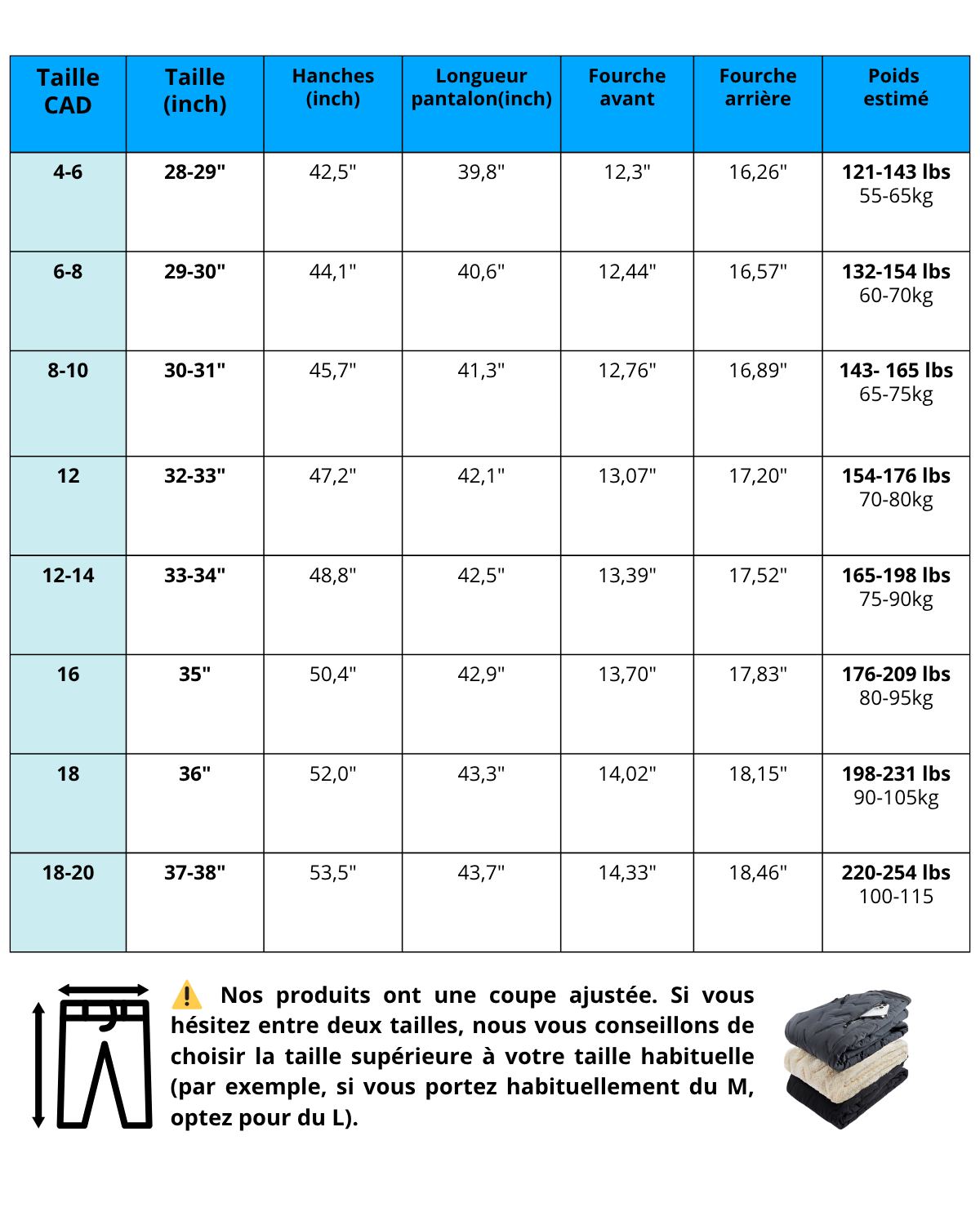 Astuce : si vous êtes entre deux tailles, nous conseillons de choisir la taille au-dessus pour plus de confort.