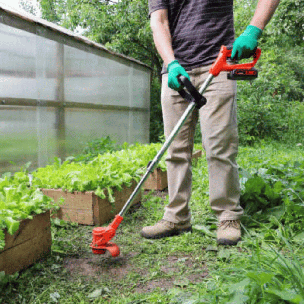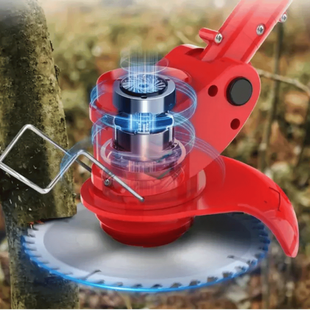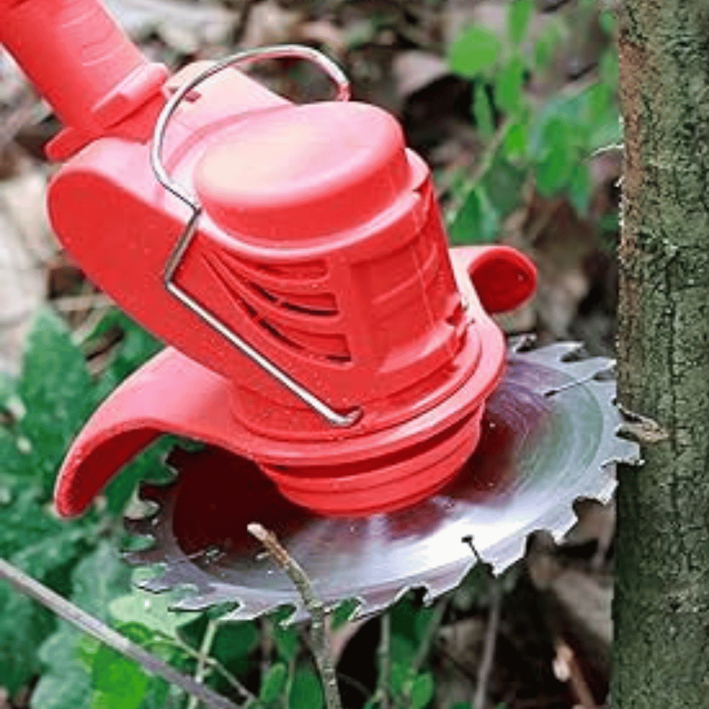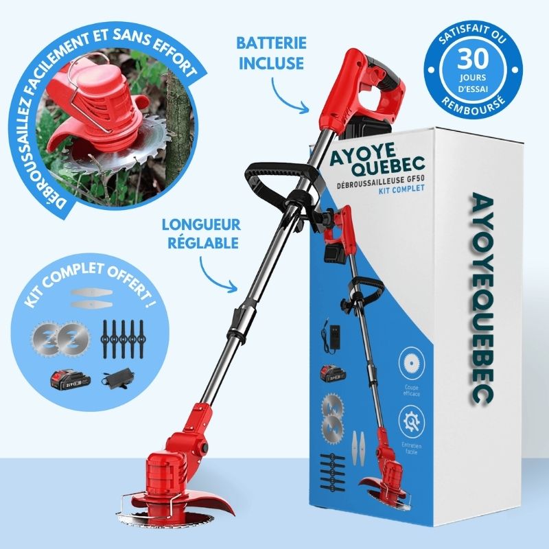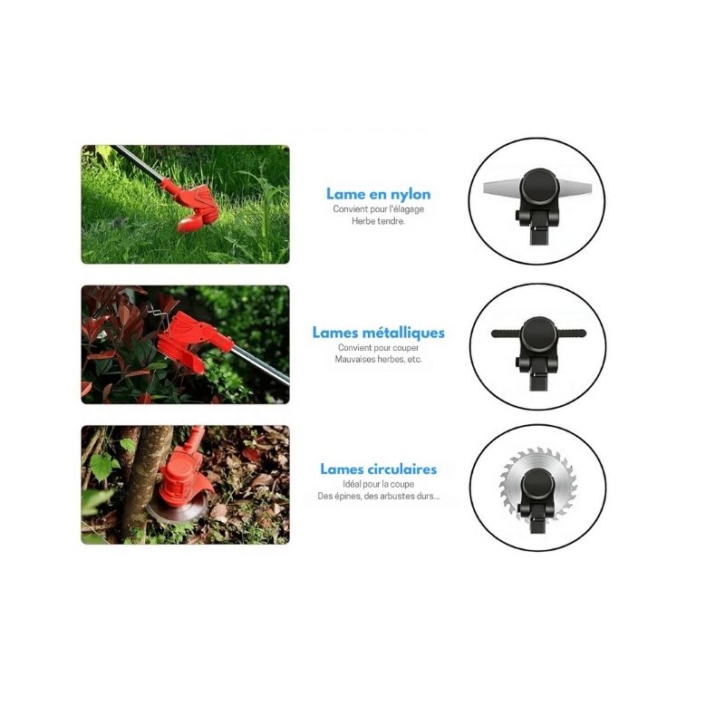 - 🔀 3 lames interchangeables – plastique (gazons), métal (broussailles) et scie circulaire (branches).