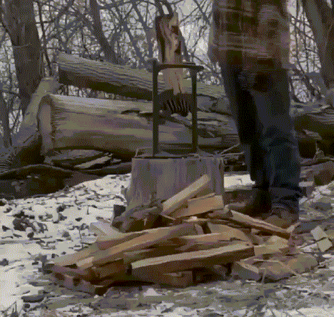 Fixez-le sur une souche ou posez-le à plat, glissez la bûche dans l’anneau puis frappez au marteau pour la fendre en allumettes.