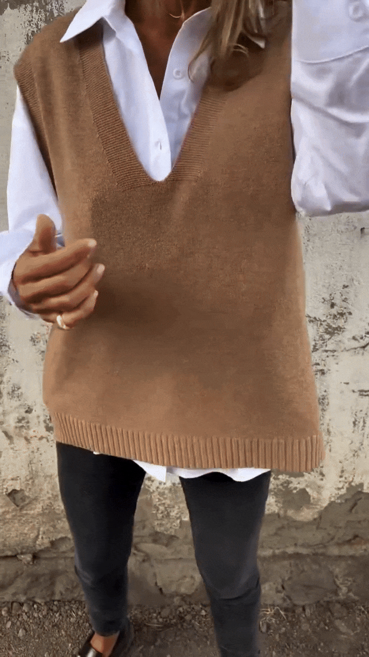 Coupe : gilet col V, boutonné devant, volume relax/cocoon