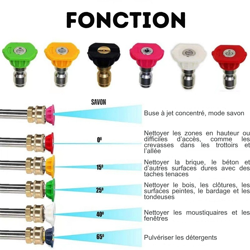 - 🔧 Connexion ¼″ universelle : se clipse sur la plupart des nettoyeurs haute pression