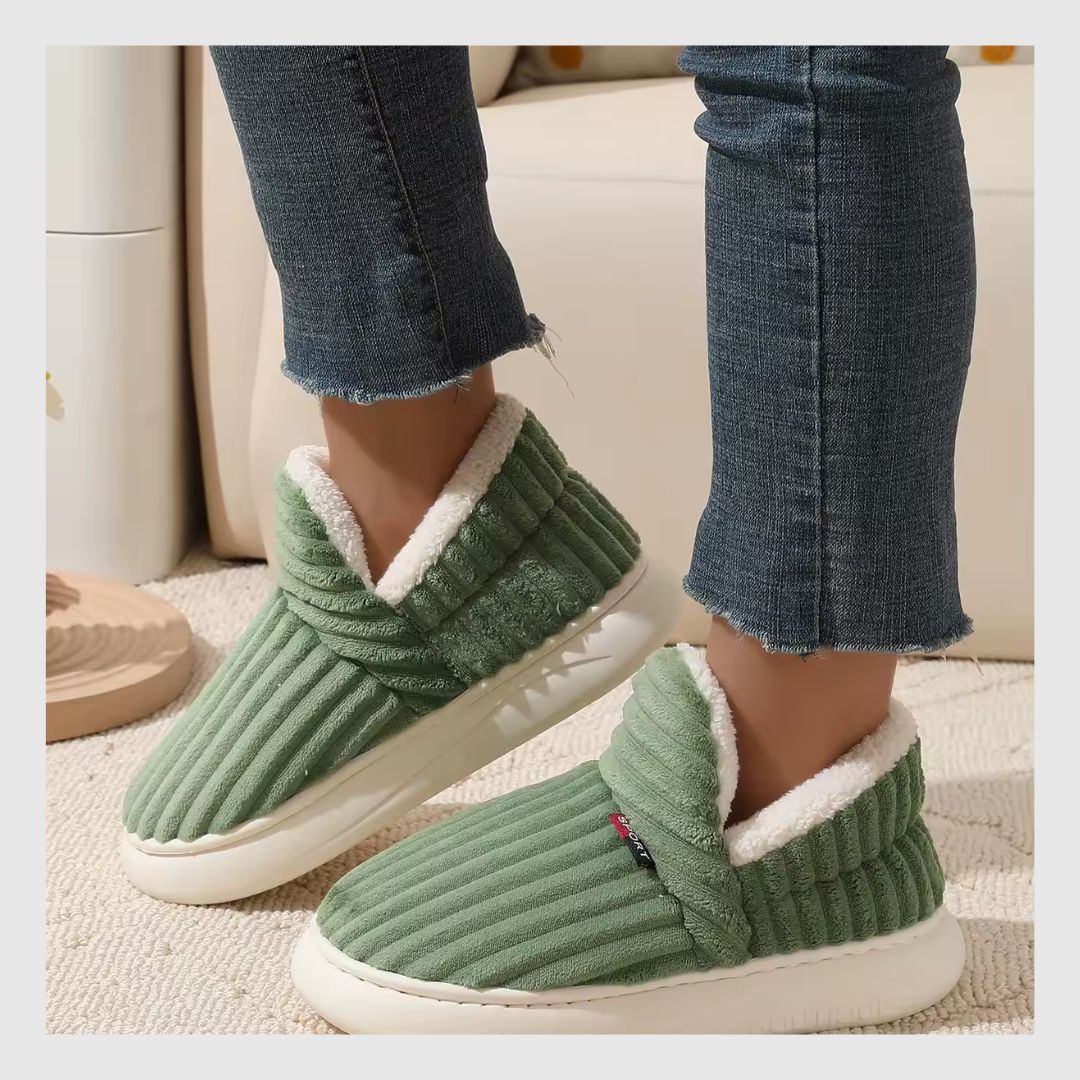 La doublure peluche crée un effet « couverture » autour du pied. L’épaisseur reste généreuse sans être lourde : parfait pour relaxer à la maison, télétravailler ou se lever la nuit sans frissonner.